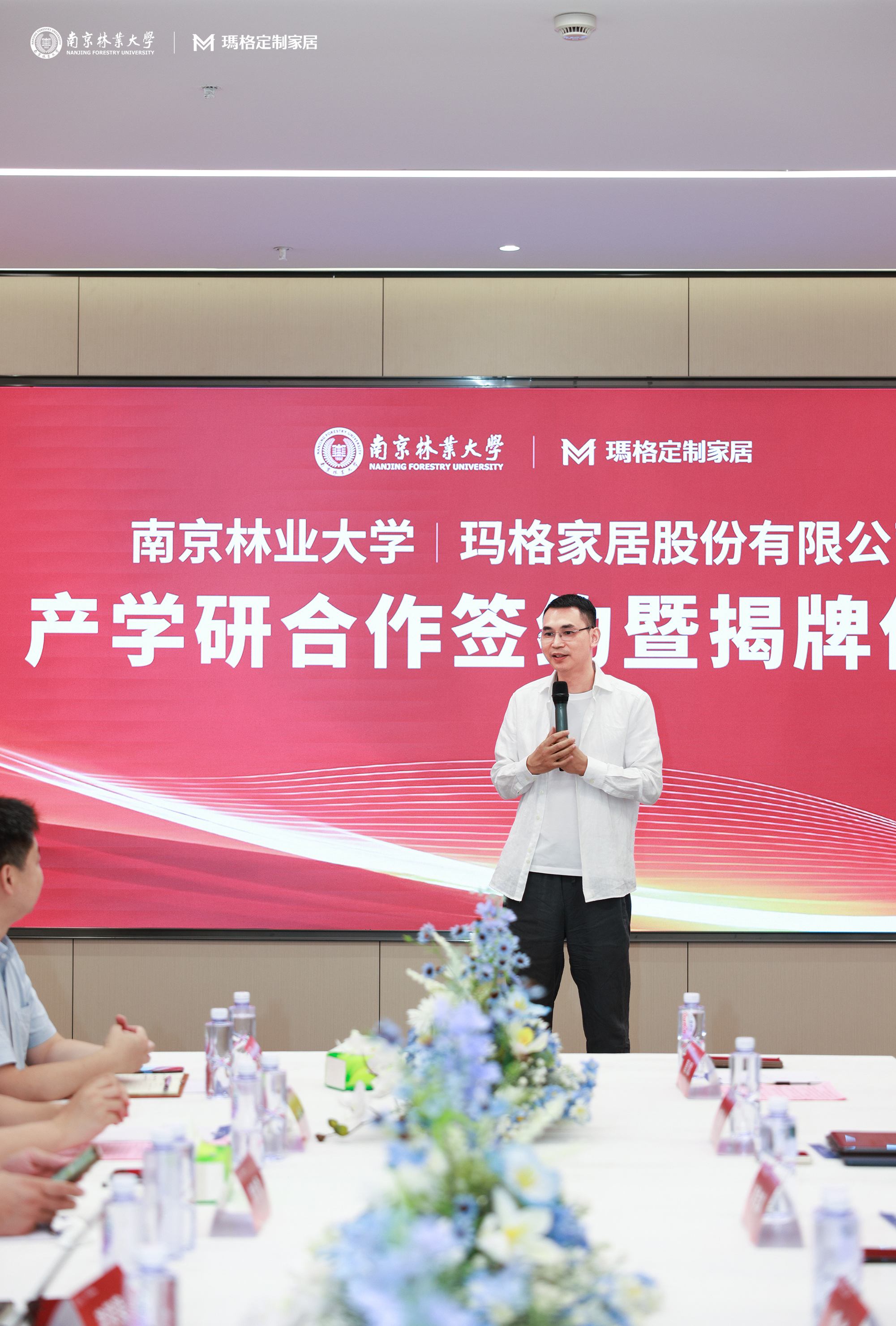 瑪格家居董事長唐斌先生向南京林業(yè)大學(xué)朱劍剛書記一行表示熱烈歡迎。他表示,校企產(chǎn)學(xué)研合作是推動技術(shù)創(chuàng)新和人才培養(yǎng)的重要模式。南京林業(yè)大學(xué)是國內(nèi)家居與實木研究的頂尖學(xué)府,與瑪格家居“科技引領(lǐng)定制”的理念高度契合。此次戰(zhàn)略合作將充分發(fā)揮校企協(xié)同優(yōu)勢,推動實木家居智能制造的技術(shù)突破和產(chǎn)業(yè)升級。