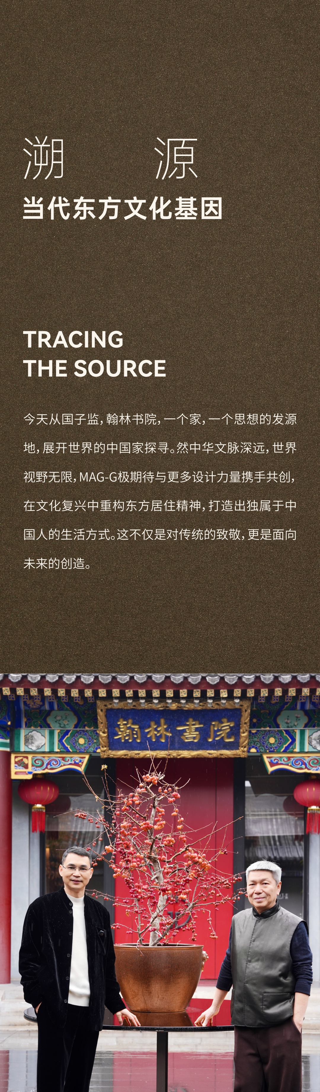 今天從國子監(jiān),翰林書院,一個(gè)家,一個(gè)思想的發(fā)源地,展開世界的中國家探尋。然中華文脈深遠(yuǎn),世界視野無限,MAG-G極期待與更多設(shè)計(jì)力量攜手共創(chuàng),在文化復(fù)興中重構(gòu)東方居住精神,打造出獨(dú)屬于中國人的生活方式。這不僅是對(duì)傳統(tǒng)的致敬,更是面向未來的創(chuàng)造。