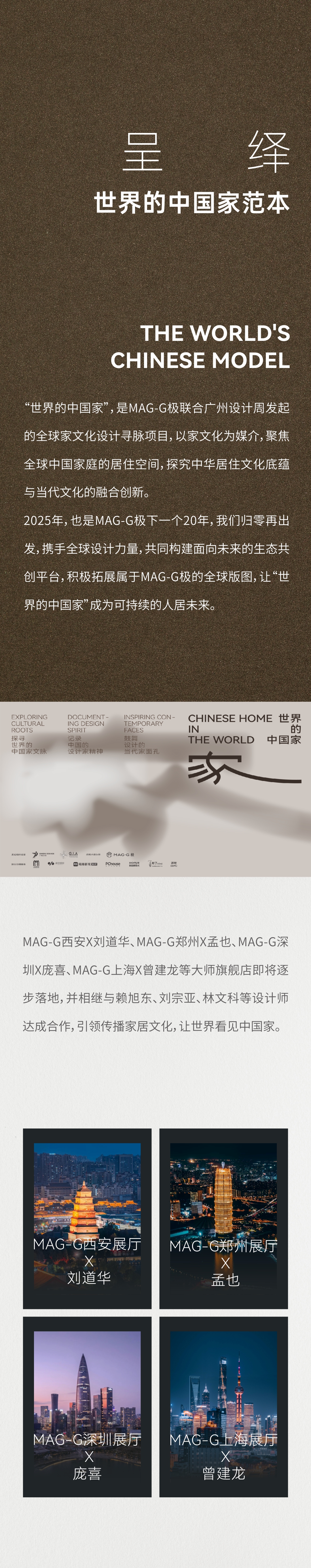 2025年,也是MAG-G極下一個(gè)20年,我們歸零再出發(fā),攜手全球設(shè)計(jì)力量,共同構(gòu)建面相未來的生態(tài)共創(chuàng)平臺(tái),積極拓展屬于MAG-G極的全球版圖,讓“世界的中國家”成為可持續(xù)的人居未來。